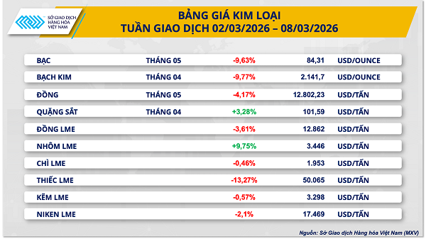 Trái ngược với diễn biến sôi động của thị trường năng lượng, thị trường kim loại quý trong tuần qua lại chịu áp lực điều chỉnh đáng kể. Giá bạc COMEX kỳ hạn tháng 5 giảm hơn 9,6% trong tuần, lùi về mức 84,3 USD/ounce, qua đó xóa bỏ phần lớn đà tích lũy tăng đạt được trong tháng trước.