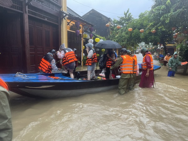 Lực lượng vũ trang hỗ trợ người dân và du khách ứng phó với ngập lũ tại khu vực Hội An.