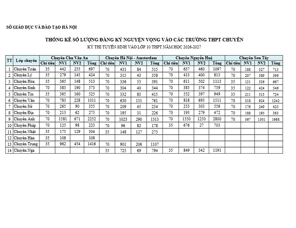 Sở Giáo dục và Đào tạo Hà Nội công bố số lượng học sinh đăng ký dự tuyển vào lớp 10 của các trường THPT công lập không chuyên và chuyên năm học 2026-2027.
