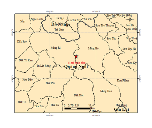 Cụ thể, tại xã Măng Bút, tỉnh Quảng Ngãi, lúc 18 giờ 52 phút 51 giây (giờ Hà Nội) ngày 5/10, một trận động đất có độ lớn 3.4 xảy ra tại vị trí có tọa độ (14.907 độ vĩ Bắc, 108.160 độ kinh Đông), độ sâu chấn tiêu khoảng 8.1 km.