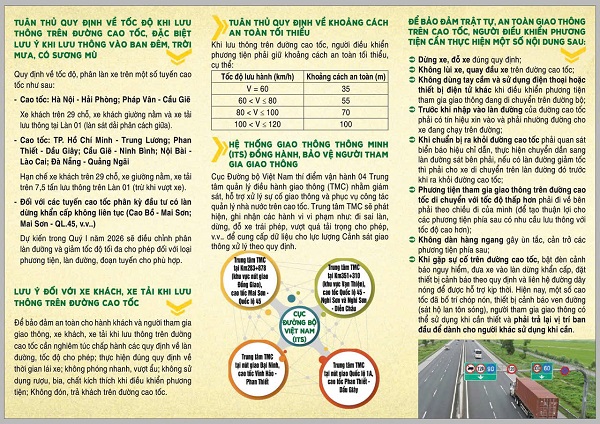 Tờ rơi cũng cập nhật quy định về tốc độ, phân làn phương tiện trên nhiều tuyến cao tốc trọng điểm như Hà Nội - Hải Phòng, Pháp Vân - Cầu Giẽ, TP.HCM - Trung Lương, Phan Thiết - Dầu Giây, Cầu Giẽ - Ninh Bình, Nội Bài - Lào Cai, Đà Nẵng - Quảng Ngãi… Các quy định được trình bày theo từng nhóm phương tiện, giúp lái xe dễ tra cứu, thực hiện đúng quy định.