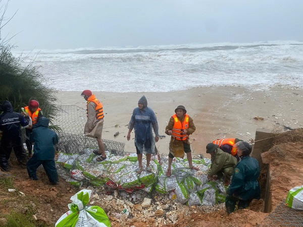 Lực lượng chức năng khắc phục sạt lở đê biển Vĩnh Thái