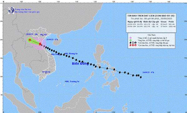 Hồi 8 giờ sáng 29/9, tâm bão số 10 ở trên đất liền khu vực Tây Nam Nghệ An. Sức gió mạnh nhất cấp 9 (75 - 88 km/giờ), giật cấp 11. Dự báo, trong 3 giờ tới, bão di chuyển theo hướng Tây Tây Bắc, tốc độ khoảng 20 km/giờ.