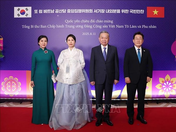 Trong khuôn khổ chuyến thăm cấp Nhà nước tới Hàn Quốc, tối 11/8, Tổng Bí thư Tô Lâm và Phu nhân, cùng Đoàn đại biểu cấp cao Việt Nam đã dự chiêu đãi cấp Nhà nước do Tổng thống Hàn Quốc Lee Jae Myung và Phu nhân chủ trì.