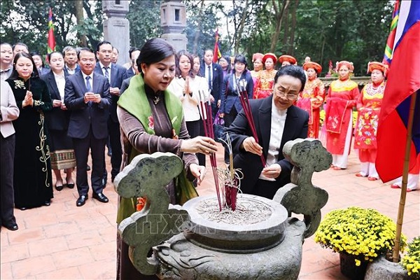 Phu nhân Ngô Phương Ly và Phu nhân Naly Sisoulith dâng hương tại Đền thờ Công chúa Nhồi Hoa - Ảnh: Minh Đức/TTXVN