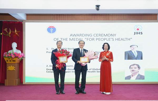Chiều 21/1, Thứ trưởng Bộ Y tế Nguyễn Thị Liên Hương đã trao kỷ niệm chương "Vì sức khỏe nhân dân" của Bộ Y tế cho GS Kokudo Norihiro, Chủ tịch Viện An ninh y tế Nhật Bản (JIHS) và các chuyên gia của Viện. Đây là phần thưởng cao quý của Bộ Y tế Việt Nam, nhằm ghi nhận những đóng góp xuất sắc, bền bỉ và đầy trách nhiệm của các cá nhân nước ngoài đối với sự nghiệp bảo vệ, chăm sóc và nâng cao sức khỏe nhân dân Việt Nam.