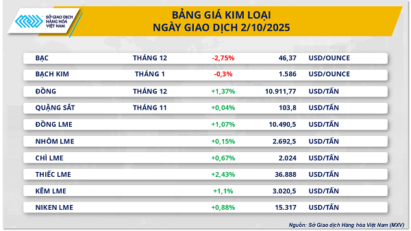 Thị trường hàng hóa nguyên liệu thế giới kết thúc phiên giao dịch ngày 2/10 với gam màu trái ngược. Chỉ số MXV-Index giảm gần 0,5% xuống 2.262 điểm khi lực bán mạnh quay lại. Đáng chú ý, giá dầu thô tiếp tục trượt dốc phiên thứ 4 liên tiếp, rơi về mức thấp nhất kể từ tháng 5. Ngược lại, thị trường kim loại công nghiệp chứng kiến điểm sáng khi giá đồng COMEX bật tăng lần thứ hai liên tiếp.